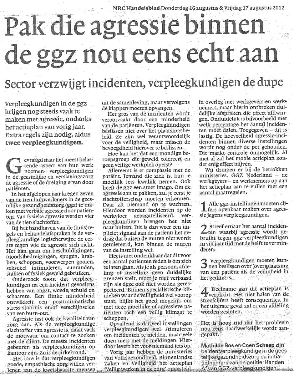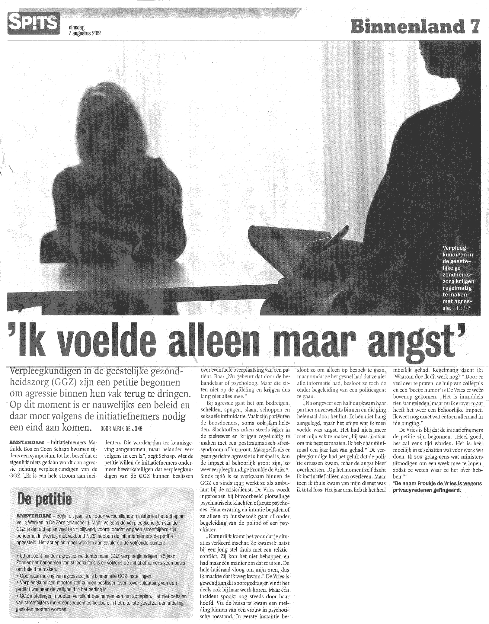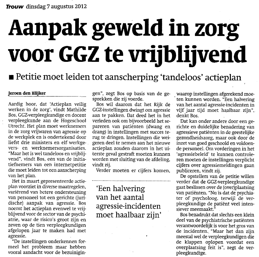 Agressie in de zorg heeft mede door toedoen van Mathilde Bos toenemend de aandacht. Alle hulpverleners lijken er vroeger of later mee te maken te krijgen. De media melden -soms zeer ernstige- geweldsincidenten binnen zorginstellingen. Wat kan een instelling en wat kan de individuele hulpverlener doen om de werkplek veilig te maken?
