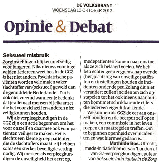 Met Coen Schaap heeft Mathilde (in 2012 - 2013) actie gevoerd om de agressie binnen de GGZ aan te pakken: Handen Af van GGZ-verpleegkundigen. De actie heeft veel aandacht gekregen in de media en in de politiek. Hun eisen waren 1) openheid over incidenten en wat ermee gedaan is en 2) zeggenschap van het slachtoffer over te nemen maatregelen.